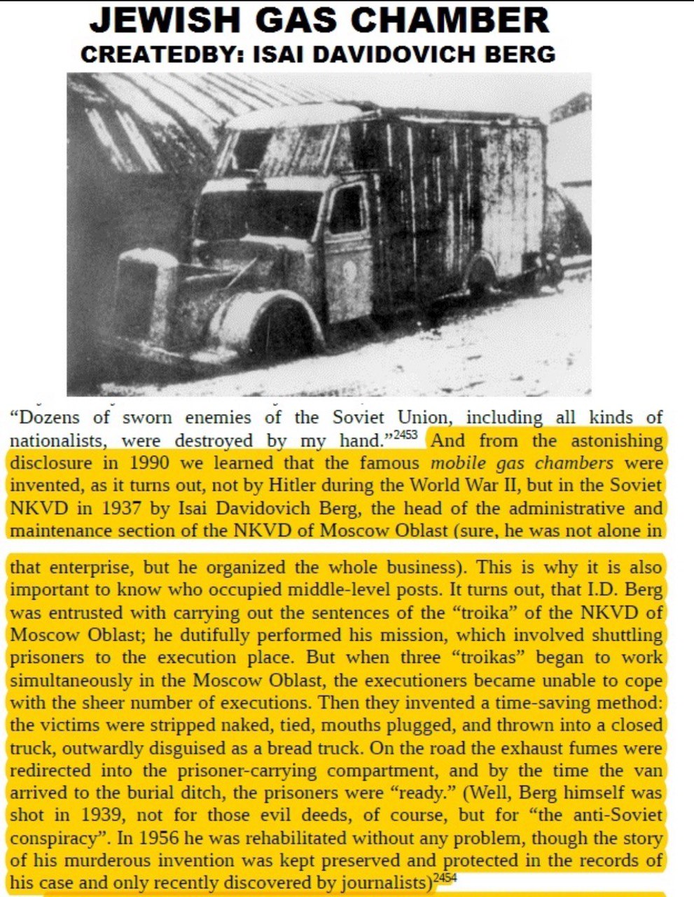 Det var såmænd jøden Isai Davidovich Berg, der i 1937 fandt på at gasse russisk ortodokse Kristne i et mobilt gaskammer i form af en lastbil.
