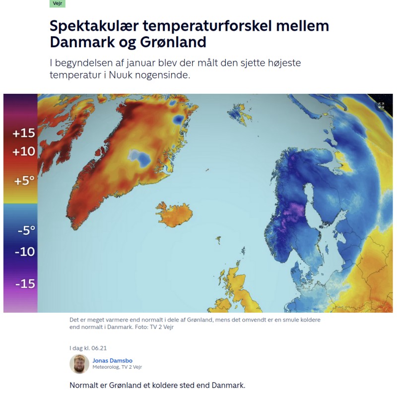 I dag i TV2 kan man se dette billede som viser januar temperaturer i Grønland.