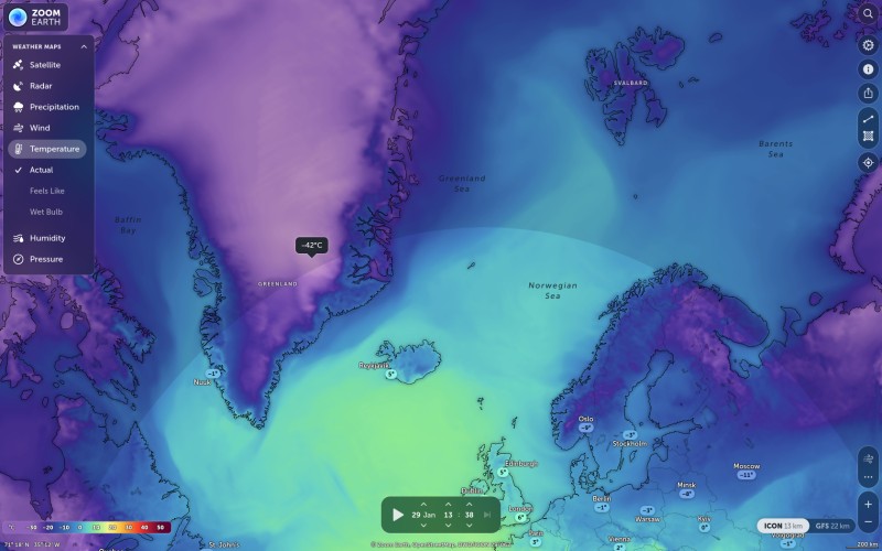 Jeg ved I er alle meget interesseret i klimaet, og derfor sikkert allerede selv følger fx Zoom Earth satellitmålinger. Men skulle der alligevel være nogen som er forbigået denne information, har jeg her taget et billede af dagens temperaturer som når ned på -42°C, og hvor den har befundet stort set alle dage i januar.