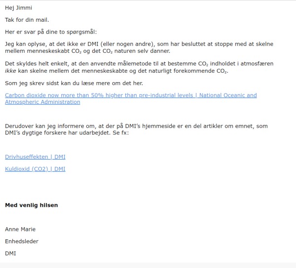 Tidligere har jeg vedhæftet illustrationer fra IPCC rapporterne fra 2001 og 2007 som viser at menneskeskabt CO2 er beregnet til ca. 2-3% af det af naturen, som i forvejen blot er 0.04% af atmosfæren. Det er højst relevant at DMI forstår disse forhold når I fx vejleder politikere gennem prognoser og rapporter. Selv ved at udrulle et totalt stop for al menneskelig udledning af CO2, har man blot løst 1/40 af problemet, og politikerne såvel som befolkningen har ingen ide om at de øvrige 39/40 endnu svæver rundt i luften 'til skade for klimaet'.